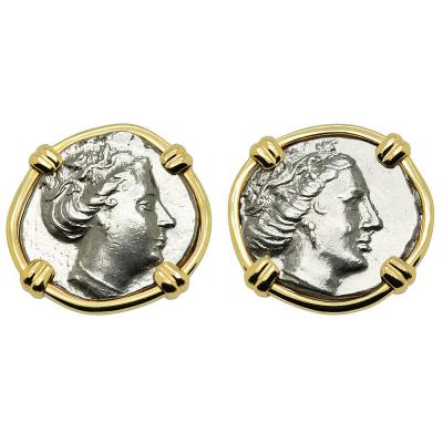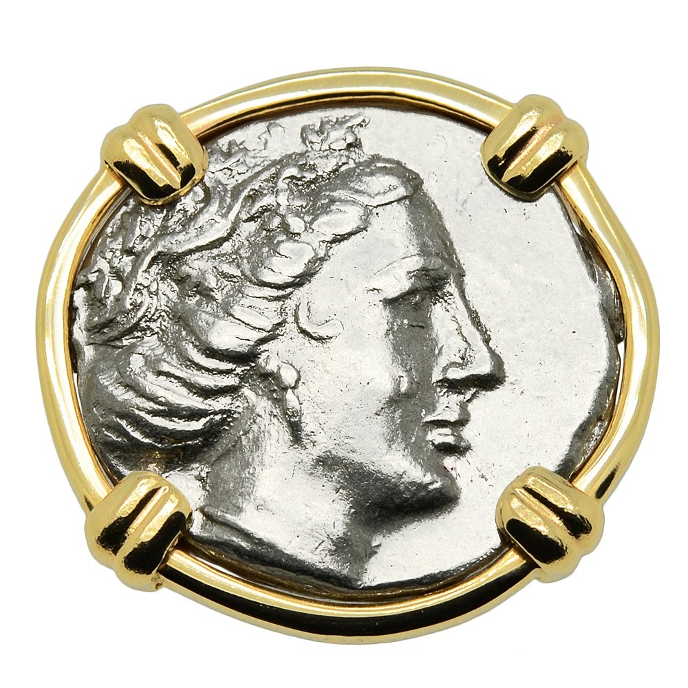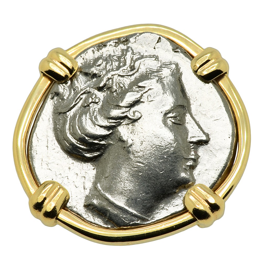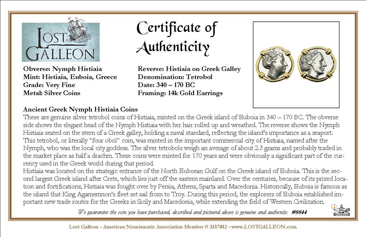 These are genuine silver tetrobol coins of Histiaia, minted on the Greek island of Euboia in 340 – 170 BC. The obverse side shows the elegant head of the Nymph Histiaia with her hair rolled up and wreathed. The reverse shows the Nymph Histiaia seated on the stern of a Greek galley, holding a naval standard, reflecting the island’s importance as a seaport.