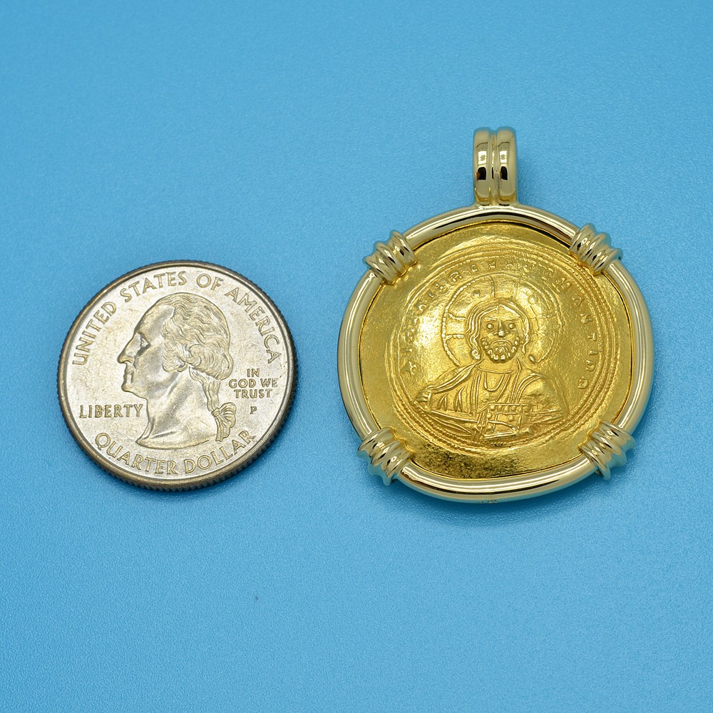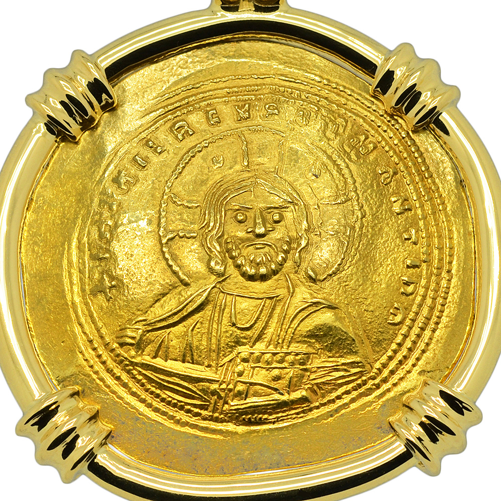 This 11th century Byzantine gold histamenon nomisma coin features Jesus Christ Pantokrator “Christ in Majesty” wearing a nimbus crown and holding the Book of Gospels. The Latin inscription IҺS XIS RЄX RЄGNANTINM translates to "Jesus Christ King of Kings." The reverse depicts the Emperor Constantine IX, standing and holding a cruciform scepter and a globus cruciger, which were Christian symbols of authority during the Medieval Period.