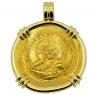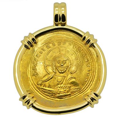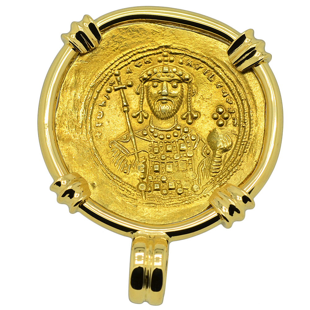 This gold coin was minted during the rule of Constantine IX, who was emperor from 1042-1055. It was during the rule of Constantine in 1054, that the centuries old disagreements finally separated the Roman Catholic and Eastern Orthodox Churches. The Byzantines however, endured for another four centuries and Christianity flourished under their protection.