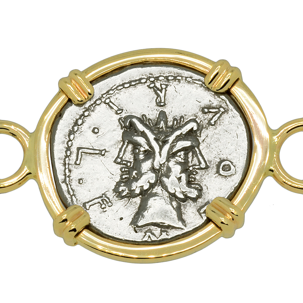 This ancient silver coin depicts Janus, who in Roman mythology was the god of gates, doorways, time, transitions, beginnings and endings. His most prominent remnants in modern culture are his namesakes: the month of January, which begins the new year and the janitor, who is a caretaker of doors and halls. Janus is most often shown as having two bearded faces or heads, facing in opposite directions. He is one of the few major deities in Roman mythology that does not have a Greek origin or counterpart.
