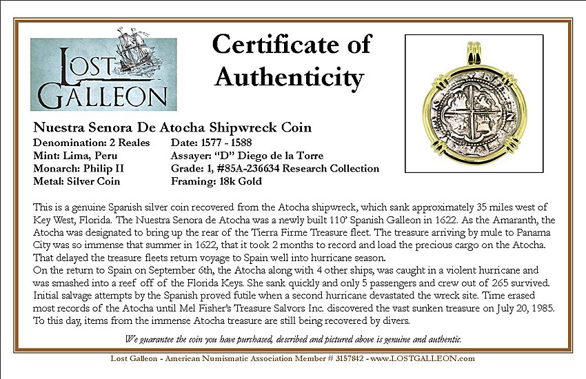 This coin also comes with Mel Fisher's Treasure Salvors Atocha photo certificate #85A-236634.