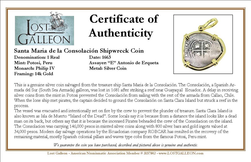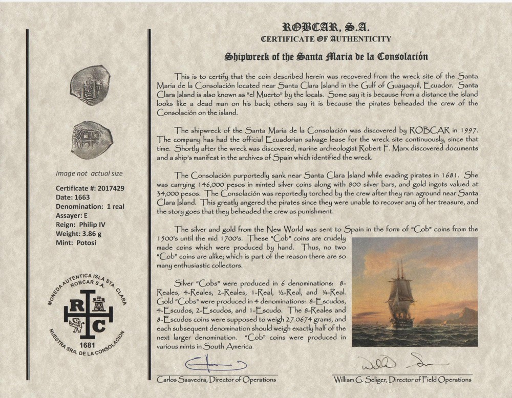 Original signed ROBCAR salvagers photo certificate included. This is a genuine silver coin salvaged from the treasure ship Santa Maria de la Consolación that sank in 1681. The Consolación, a Spanish Armada del Sur (South Sea Armada) galleon, was lost in 1681 after striking a reef near Guayaquil Ecuador. A delay in receiving silver coins from the mint in Potosi prevented the Consolación from sailing with the rest of the armada from Callao, Chile. When the lone ship met pirates, the captain decided to ground the Consolación on Santa Clara Island but struck a reef in the process. The vessel was evacuated and intentionally set on fire by the crew to prevent the plunder of treasure.