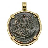 • Byzantine 1078–1081, bronze follis in 14k white gold pendant.