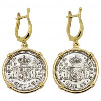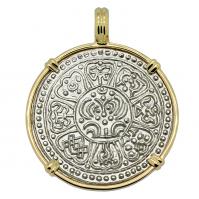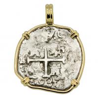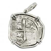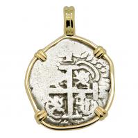 • Colonial Spanish Peru, King Charles II one real dated 1687 in 14k white gold pendant.