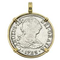 • Spanish 2 reales dated 1783 in 14k gold pendant, The 1784 Shipwreck that Changed America.