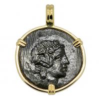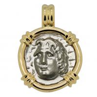 • Greek 115-90 BC, Ares "God of War" and sword bronze coin in 14k white gold pendant.