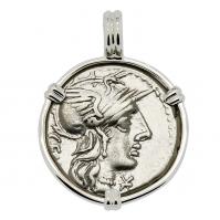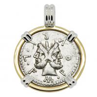 • Roman Republic 122 BC, Roma and Dioscuri denarius in 14k gold pendant.