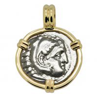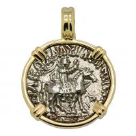 • Greek - Italy 272-240 BC, Taras riding Dolphin and Horseman nomos in 14k white gold pendant.