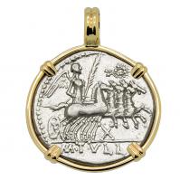 • Roman Republic 82-81 BC, Anna Perenna and Victory chariot denarius in 14k gold pendant.