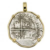 • Colonial Spanish Peru, King Philip IV one real dated 1658 in 14k gold pendant.