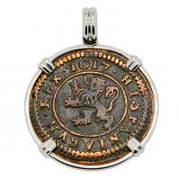• Spanish 4 maravedis dated 1617 in 14k white gold pendant.