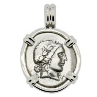 • Roman Republic 120 BC, Janus and Roma denarius in 14k white gold pendant.