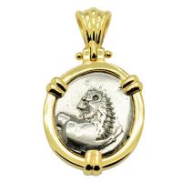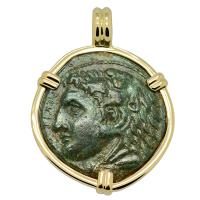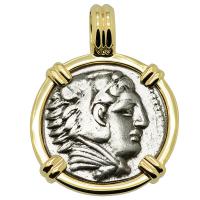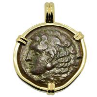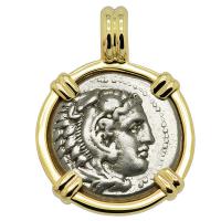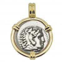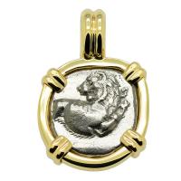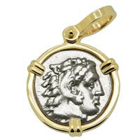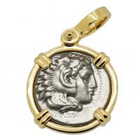 • Greek 328-323 BC Lifetime Issue, Alexander the Great drachm in 14k gold pendant.