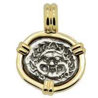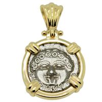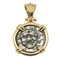 • Greek 480-450 BC, Gorgon and anchor drachm in 14k gold pendant.