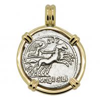• Roman Republic 109-108 BC, Roma and Victory chariot denarius in 14k gold pendant.