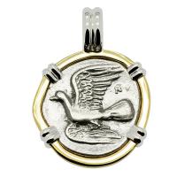 • Greek 330-280 BC, Dove and Chimaera triobol in 14k white and yellow gold pendant.