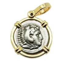 • Greek 325-323 BC Lifetime Issue, Alexander the Great drachm in 14k gold pendant.