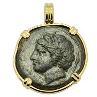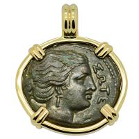 • Greek Syracuse 317-289 BC, Persephone and Bull with Dolphins bronze coin in 14k gold pendant.