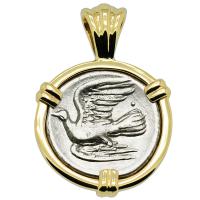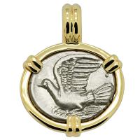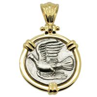 • Greek 330-280 BC, Dove and Chimaera triobol in 14k gold pendant.