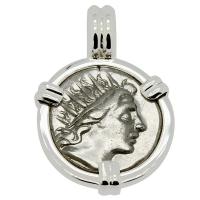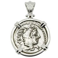 • Roman Republic 105 BC, Queen Goddess Juno denarius in 14k white gold pendant.