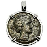• Greek Syracuse 317-289 BC, Artemis and winged lightning bolt bronze litra coin in 14k white gold pendant.