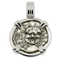 • Greek 480-450 BC, Gorgon and anchor drachm in 14k white gold pendant.