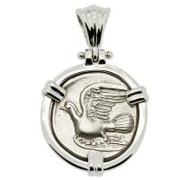 • Greek 330-280 BC, Dove and Chimaera triobol in 14k white gold pendant.