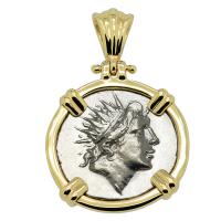 • Greek 88-84 BC, Sun God Helios and rose drachm in 14k gold pendant.