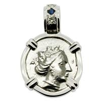 • Greek 340-170 BC, Nymph Histiaia tetrobol in 14k white gold pendant with diamonds and sapphire.