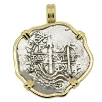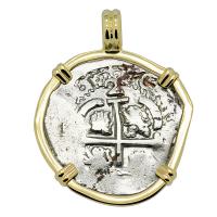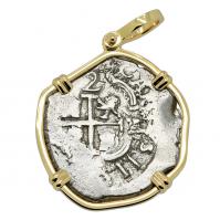 • Colonial Spanish Peru, King Charles II two reales dated 1676 in 14k gold pendant.