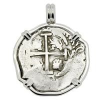 • Colonial Spanish Peru, King Philip V two reales dated 1701 in 14k white gold pendant.