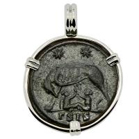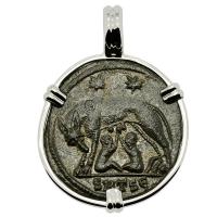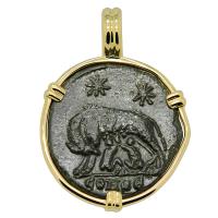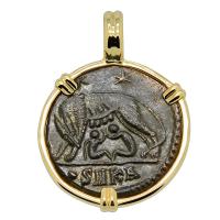 • Roman Empire AD 330-336, She-Wolf Suckling Twins nummus in 14k gold pendant.