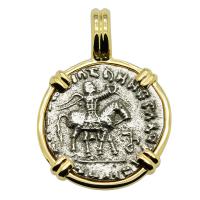 • Roman Empire AD 332-333, Constantinopolis and Victory nummus in 14k gold pendant.