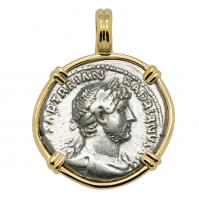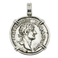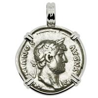 • Roman Empire AD 119-120, Hadrian and Pax denarius in 14k white gold pendant.