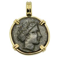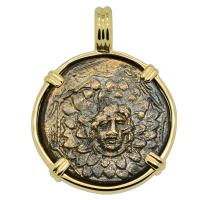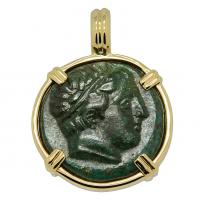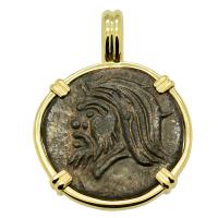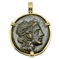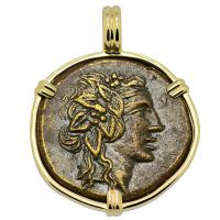 • Greek 110-90 BC, God of Wine Dionysus and thyrsus bronze coin in 14k gold pendant.