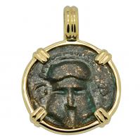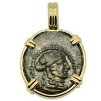 • Greek 400-350 BC, Corinthian Helmet bronze coin in 14k gold pendant.