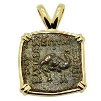 • Indo-Greek 165-130 BC, Elephant and Club of Hercules bronze coin in 14k white gold pendant.