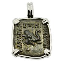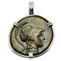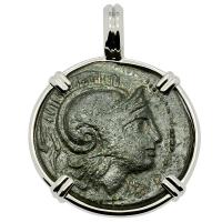 • Greek 317-289 BC, Athena and Lightning Bolt bronze coin in 14k white gold pendant.