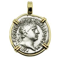 • Roman Empire AD 103-111, Emperor Trajan and Trophy denarius in 14k white gold pendant.