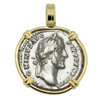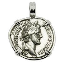 • Roman Empire AD 147-148, Antoninus Pius and Annona denarius in 14k white gold pendant.