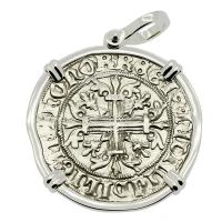 • French 1417-1422, King Charles VI Gros dit Florette in 14k white gold pendant.