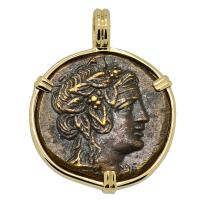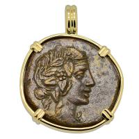 • Greek 120-63 BC, God of Wine Dionysus and Cista Mystica bronze coin in 14k gold pendant.