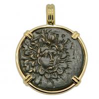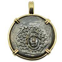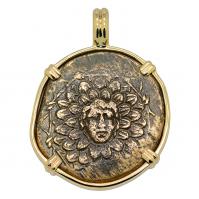 • Greek 120-63 BC, Medusa and Nike bronze coin in 14k gold pendant.