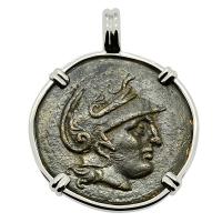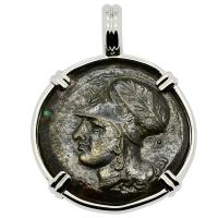 • Greek 400-350 BC, Corinthian Helmet bronze coin in 14k white gold pendant.