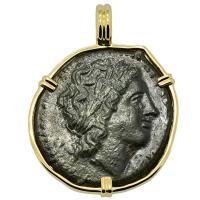 • Mamertines "Sons of Mars" 288-278 BC, Zeus and Bull bronze coin in 14k gold pendant.