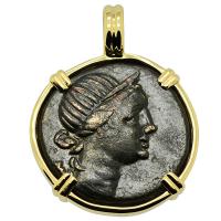 • Greek 125-100 BC, Goddess of Women Artemis bronze coin in 14k gold pendant.