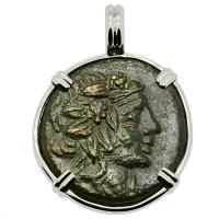 • Greek 120-63 BC, God of Wine Dionysus and Cista Mystica bronze coin in 14k white gold pendant.