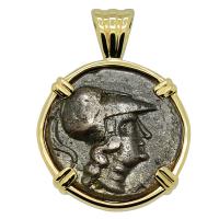 • Greek 405-367 BC, Athena and Hippocamp bronze litra in 14k gold pendant.