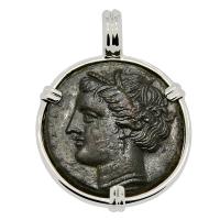 • Greek Syracuse 317-310 BC, Persephone and Bull with Dolphin bronze coin in 14k white gold pendant.
