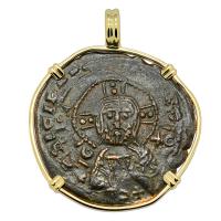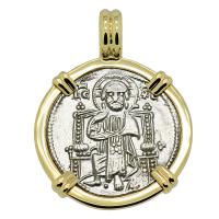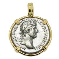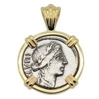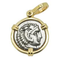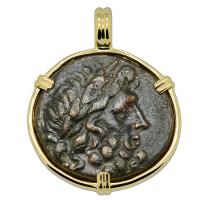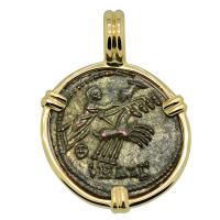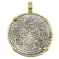 • Greek - Italy 290-281 BC, Taras riding Dolphin and Horseman nomos in 14k gold pendant.